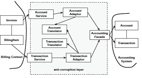 - Anticorruption Layer (ACL): Isolated layer that manages the mapping or translations between the domain models of the Bounded Contexts to maintain compatibility between them.