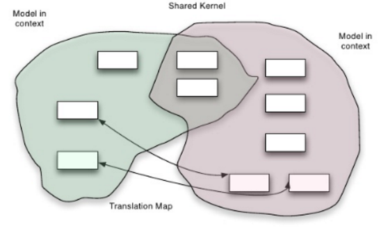 - Shared Kernel: Bounded Contexts that share/reuse part of the domain model, with an interdependence or a shared common area. These shared elements should not be modified without consulting the affected teams: