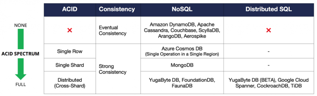 Over time, NoSQL databases have improved their features to offer us ACID according to the type (Single Row, Single Shard or Distributed):