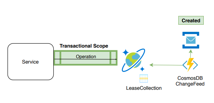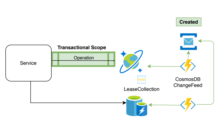 Azure Cosmos Db gives us the option of strong consistency (single region/single operation) and guaranteeing ACID through TransactionalBatch. Offering us the Change Feed Functions in which it will notify us of any insertion or update of a specific container. For this, we will need a collection where we will save the processed state of the notifications (lease containers).